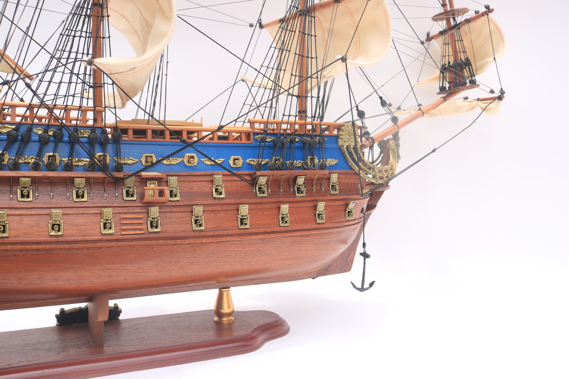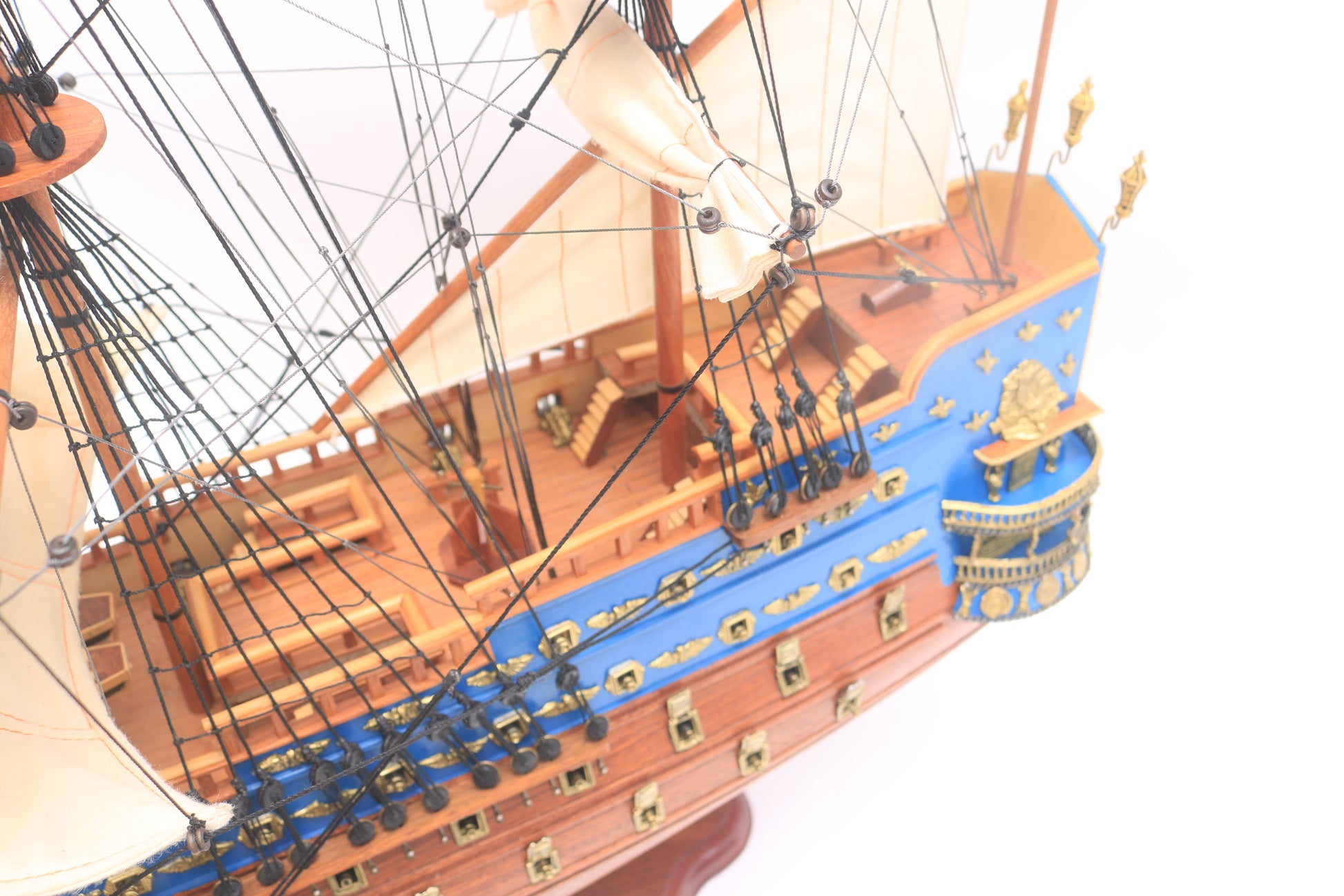 Dieses hochwertige, handgefertigte Modellschiff der San Felipe bringt die Eleganz und Macht eines der berühmtesten Linienschiffe des 18. Jahrhunderts in Ihr Zuhause. Mit kunstvoller Takelage, goldenen Kanonendetails und präzisen Holzverzierungen ist es ein exklusives Sammlerstück für Liebhaber historischer Marinekunst.